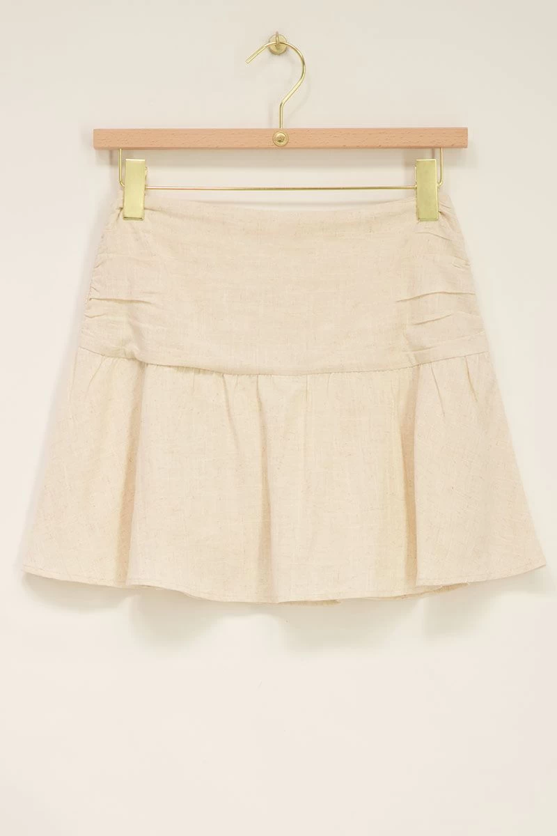 Deze beige linnen look skort met plooien is perfect voor het warme weer. Je kan de skort combineren met een kleurrijke top, bikini top of met een longsleeve. Kies je favoriete sieraden erbij uit om je look compleet te maken.
