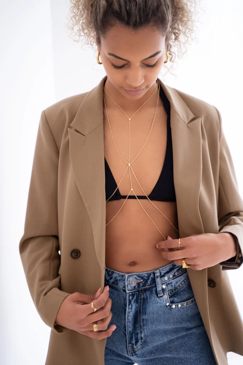 Finishing touch! Een nieuwe trend die je look een stunning effect geeft. Ingelegd met meerdere strass stenen en verschillende kettingen, is deze body chain een eye catcher die je een onvergetelijke tijd gaat brengen. Combineer het sieraad met je bikini of draag de ketting over je outfit. Maak je look af met deze body chain met strass stenen!