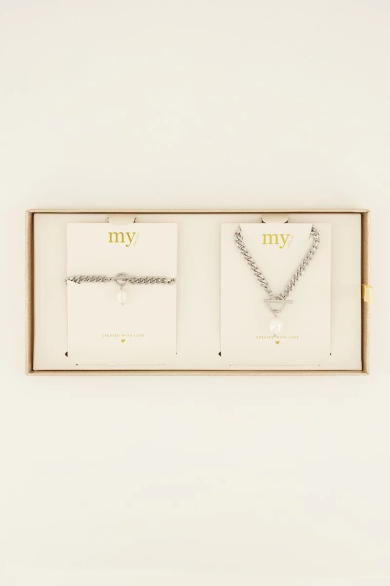 The season of gift-giving! Door deze leuke giftbox heb jij zeker weten het leukste cadeau voor haar om te geven en stiekem ook om te krijgen! Deze box bevat een mooie ketting en armband met grove schakels en parels. Een goed classy sieraad die eindeloos gecombineerd kunnen worden met iemand zijn huidige sieraden. Leuk verpakt in een mooie glitter giftbox! Wat wil je nog meer?