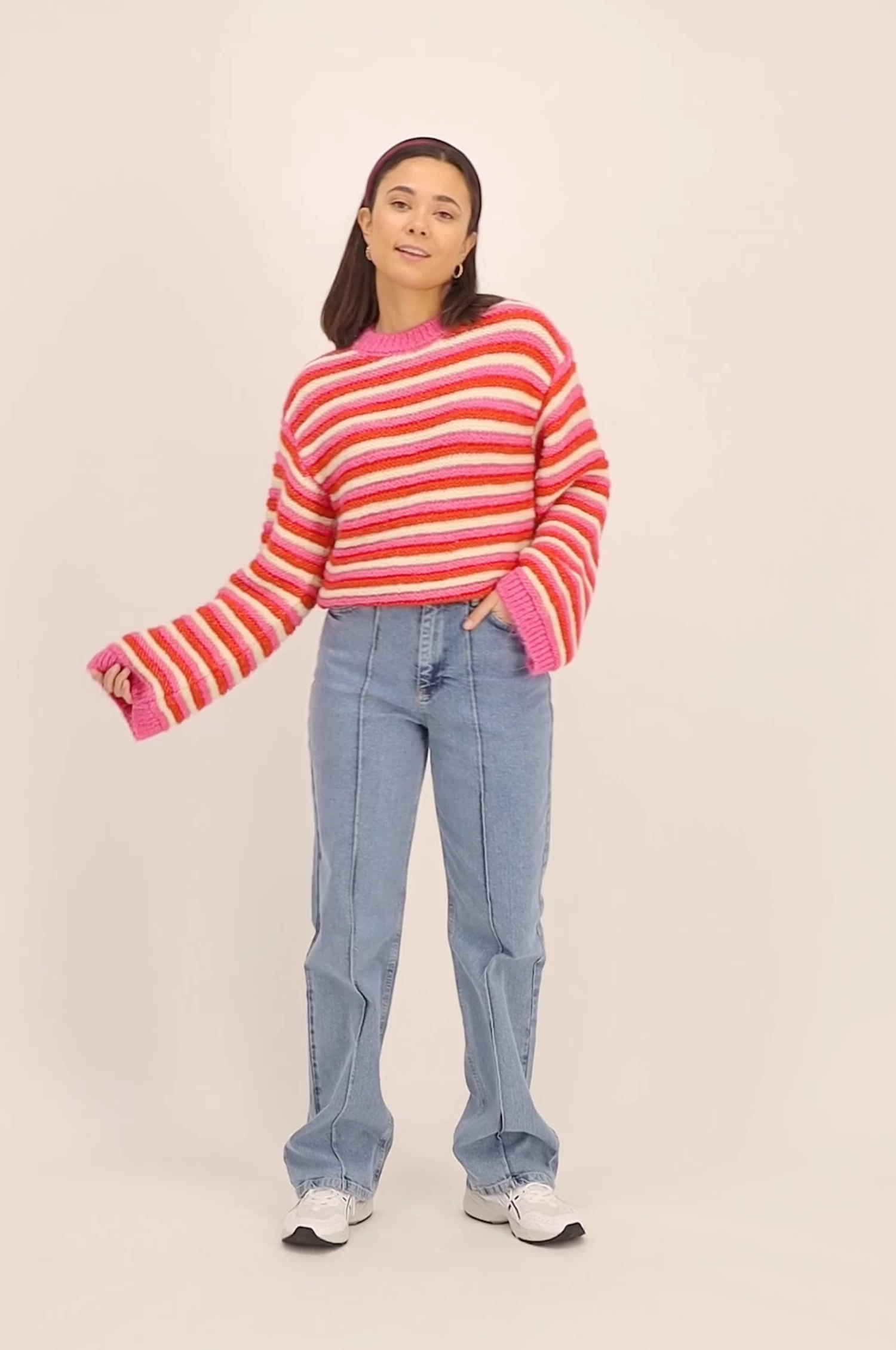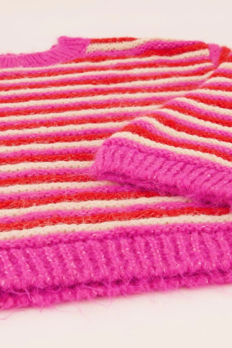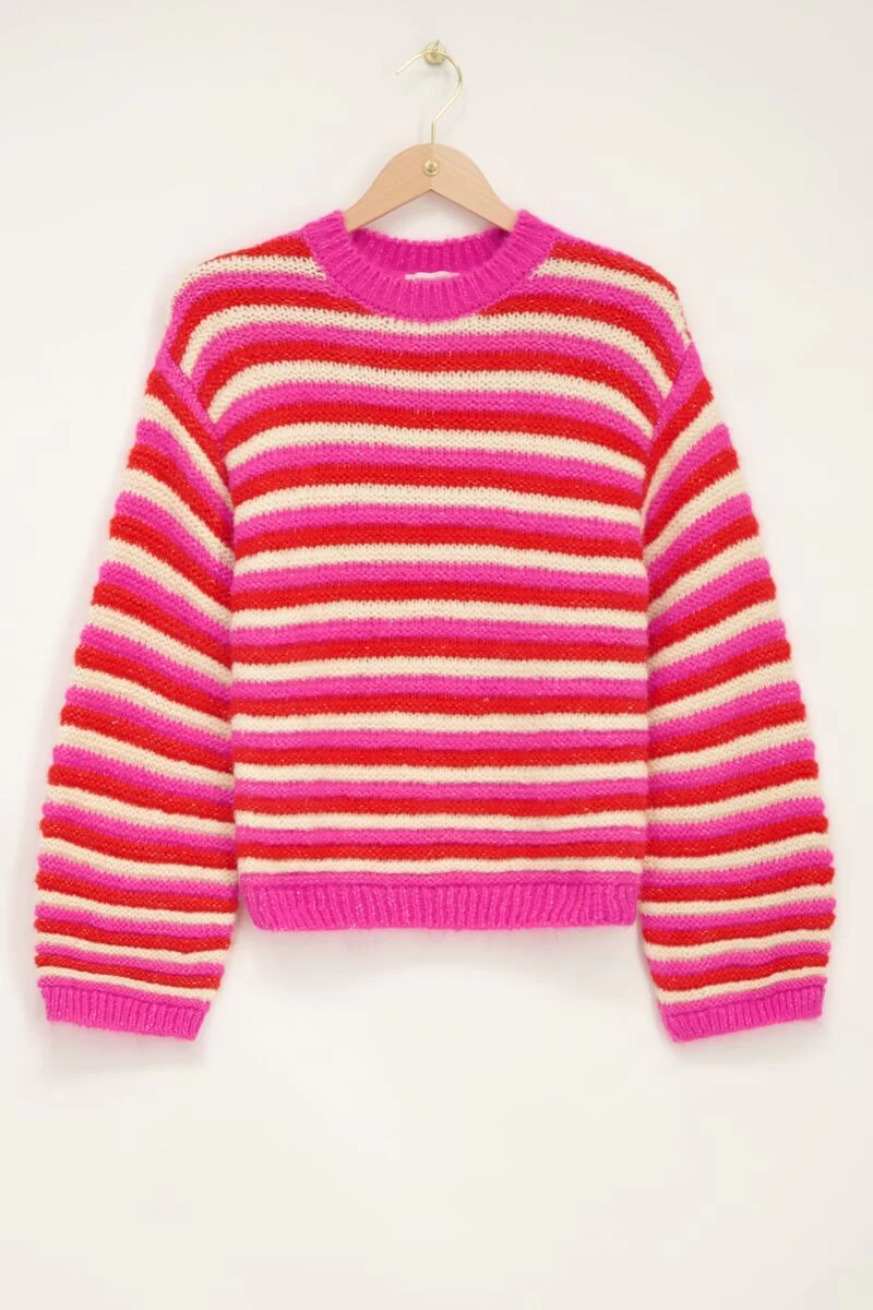 Stripes never get bored! Een onmisbare trui met roze gekleurde strepen en wijde mouwen. Stel jezelf een lange strandwandeling voor, deze trui is een ideaal item dat je een warm & gezellig gevoel geeft. Een knipoog naar de laatste trends, want streepjes zullen nooit vervelen! Heb jij de trui al in je shoppingbag?