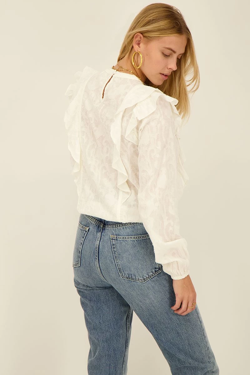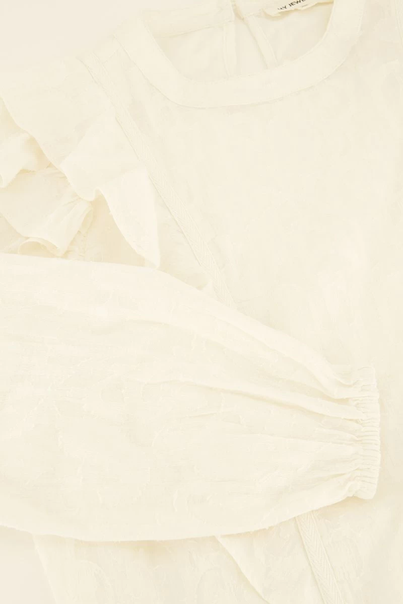 Wauw! We love deze witte jacquard top met lange mouwen & ruffles. Met deze top ben je gegarandeerd on-trend. Wij snappen dat want met dit item kun je eindeloos mixen & matchen. En wil je je look iets meer kleur geven? Combineer de top dan met een leuke gilet. Vergeet ook niet je look af te maken met je favoriete sieraden en you are ready.